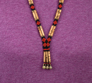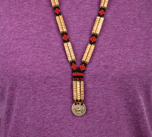 Hingucker für den Hals: Aus vielen kleinen Perlen (schwarz / rot / gold) und dünnen Bambusstäbchen bestehen diese Ketten – wahlweise mit einer Medaille oder kleinen Kügelchen als Anhänger.