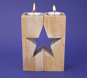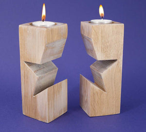 Auch einzeln spenden sie warmes Licht - aber erst als Duo entfalten die Holzelemente ihre ganze Wirkung. Das Eichenholz gibt ihnen ein gewisses Gewicht und damit auch eine gute Standfestigkeit. In Handarbeit hergestellt in den caritativen Werkstätten Spectrum Aachen.