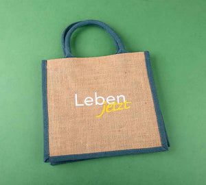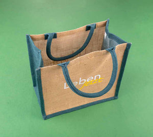 Zweifarbige, große Tasche (30 x 30 x 20 cm) aus nachhaltiger Jute, gefertigt in Indien unter – durch regelmäßige SMETA-Audits belegten – fairen Bedingungen. Diese Tasche sticht allein durch ihre Form und Farbgebung positiv hervor. Aber nicht nur das macht sie so besonders: dank ihres Formats passen auch größere Einkäufe problemlos hinein, sie ist ausgesprochen stabil verarbeitet, und die runden Henkel machen das Tragen auch bei gewichtigem Inhalt angenehmer.